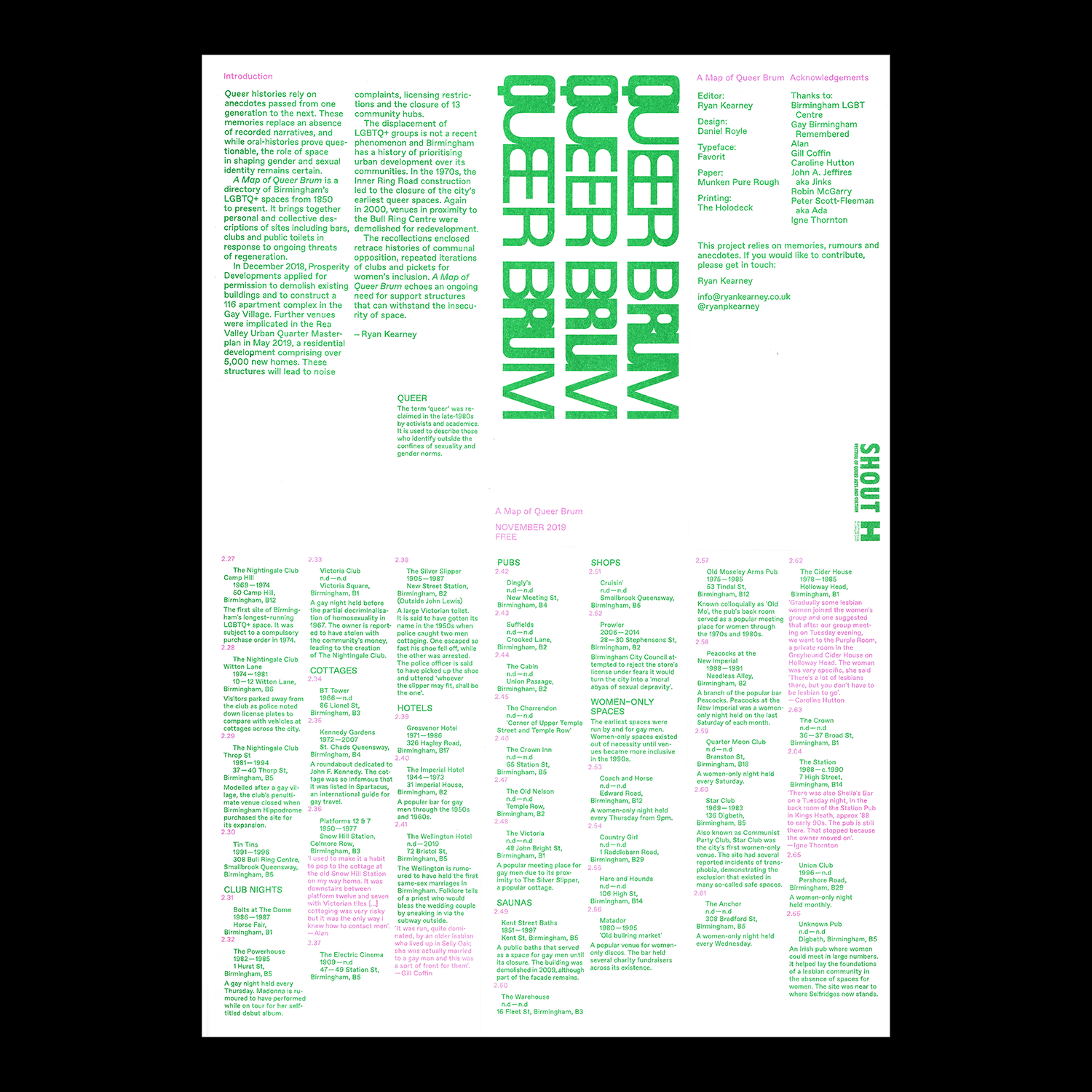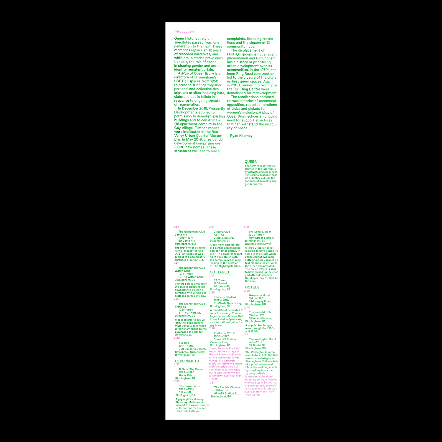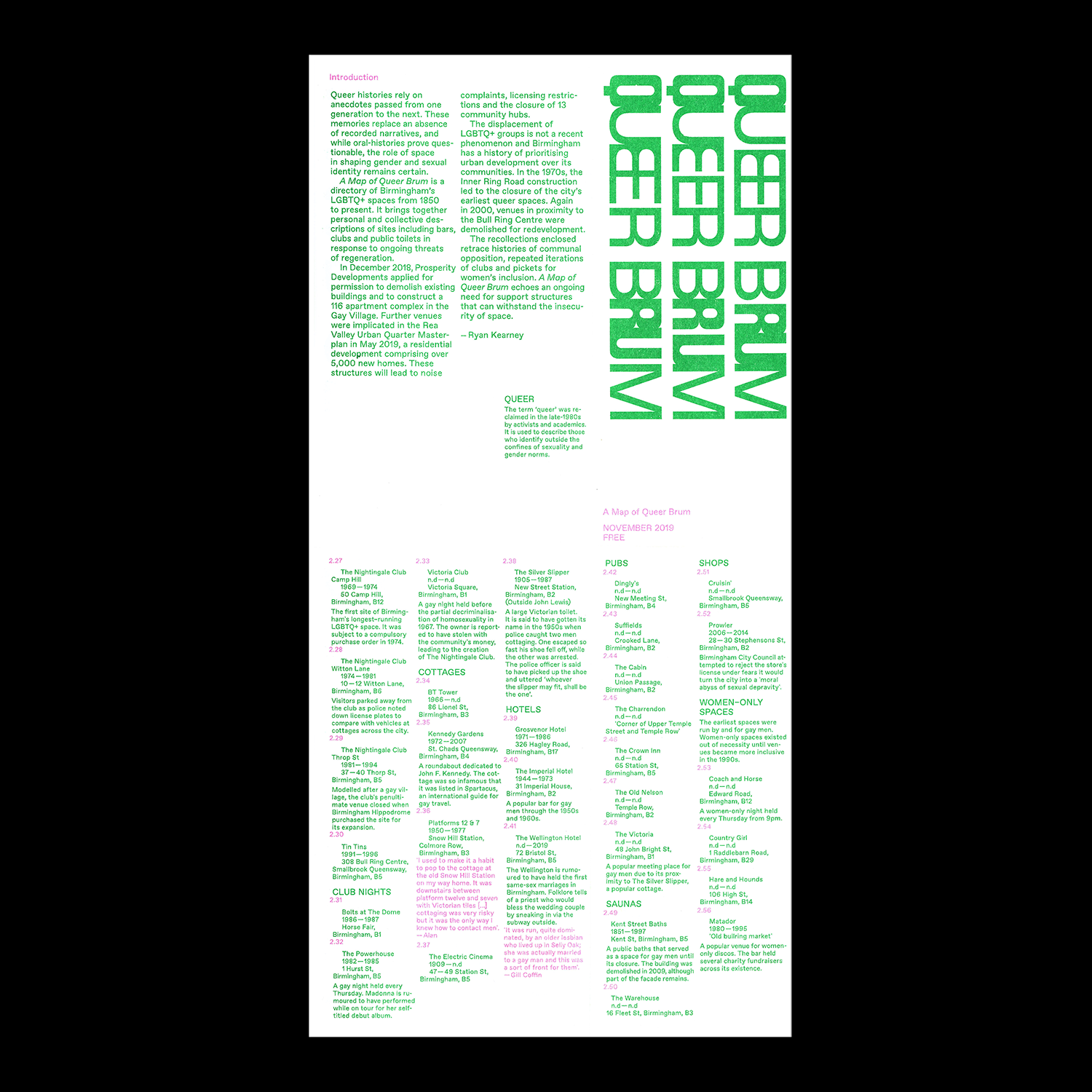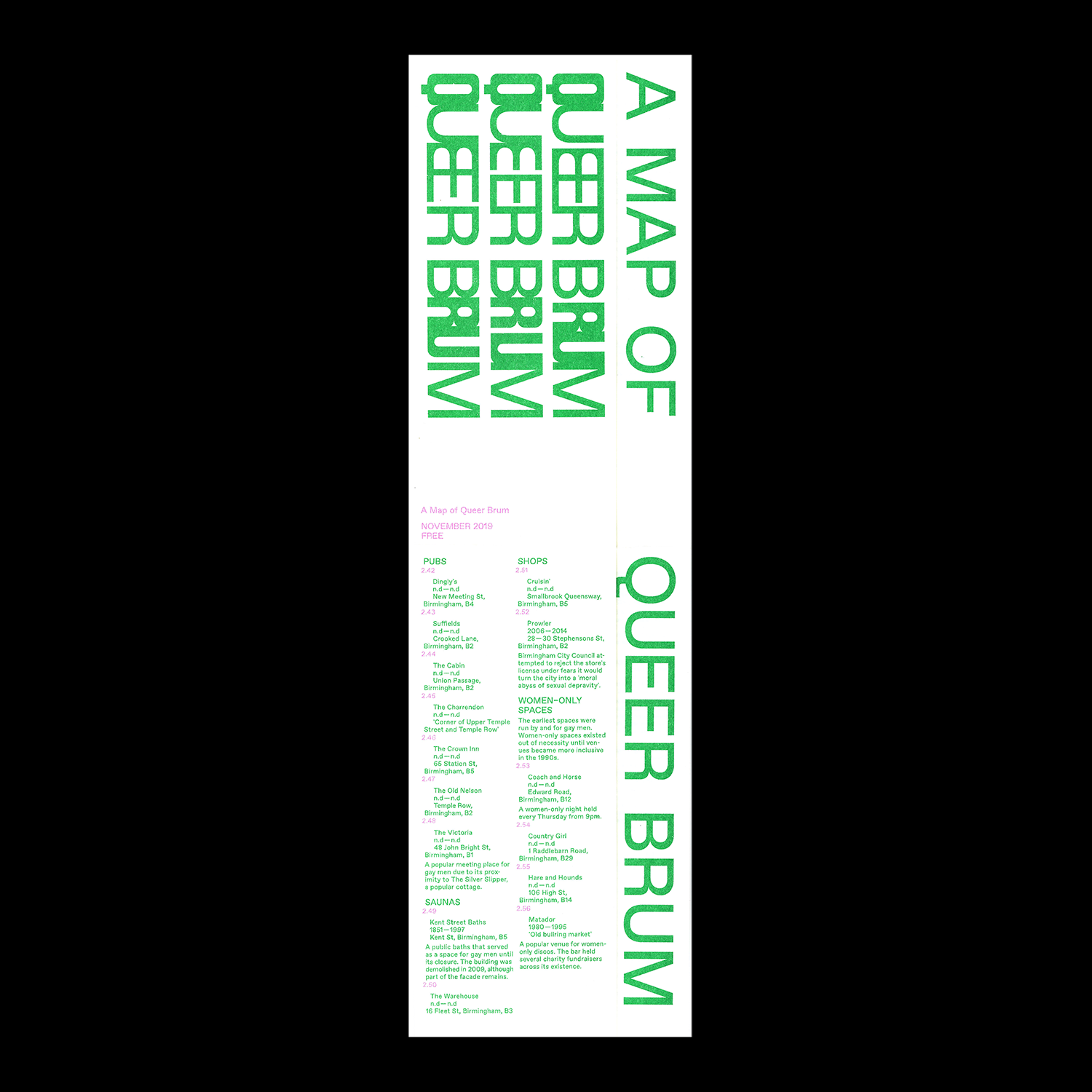 A Map of Queer Brum is a directory of Birmingham’s LGBTQ+ spaces from 1850 to present. It brings together personal and collective descriptions of sites including bars, clubs and public toilets in response to ongoing threats of regeneration.
